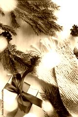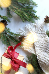 Christmas gift and fir branches with cones and knitted white scarf in blurry garland lights, top view, Flat lay. Xmas greeting card and New Year winter holiday background.