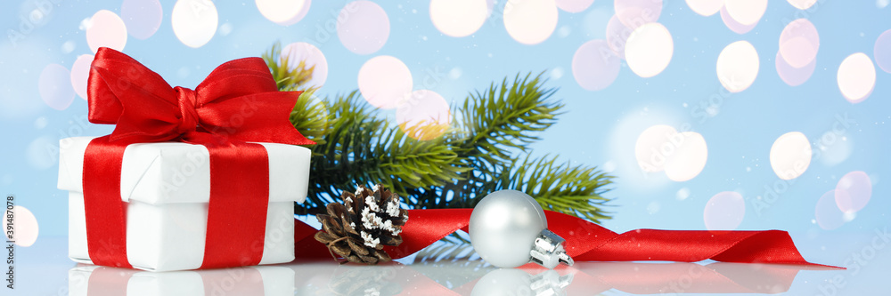 Christmas gift box with red bow and decorations on blue background