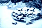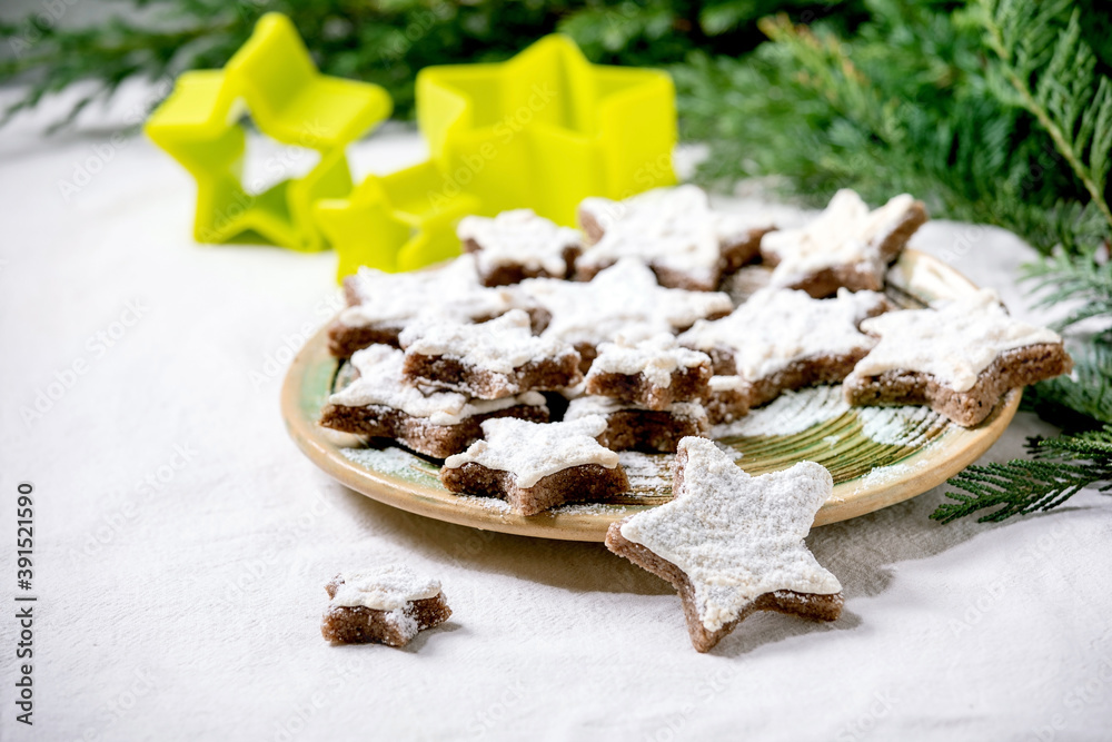Homemade star shape cocoa almond cookies with white glaze and icing sugar. On ceramic plate with xmas stars cookies cutters, thuja branches, decorations over white tablecloth. Copy space