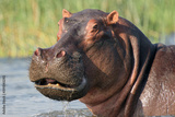 The common hippopotamus (Hippopotamus amphibius) or hippo in the river. Portrait of a hippo in the river.