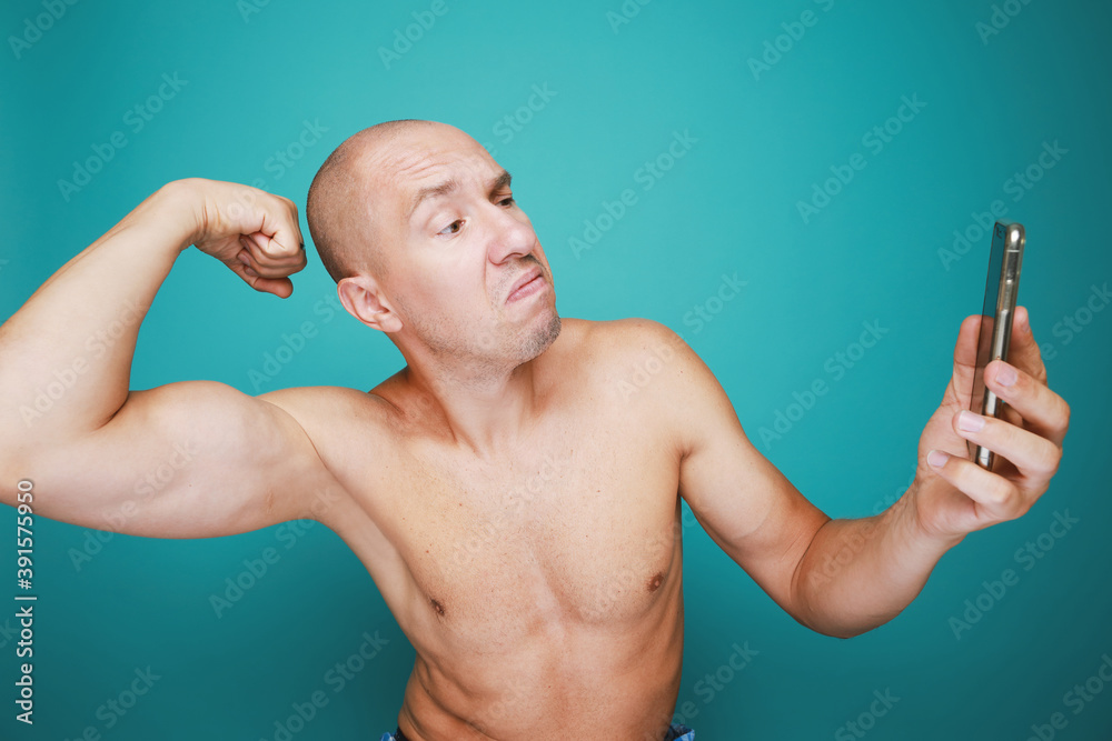 A funny bald and naked man with emotions holds mobile phone and taking selfie with him muscle arm