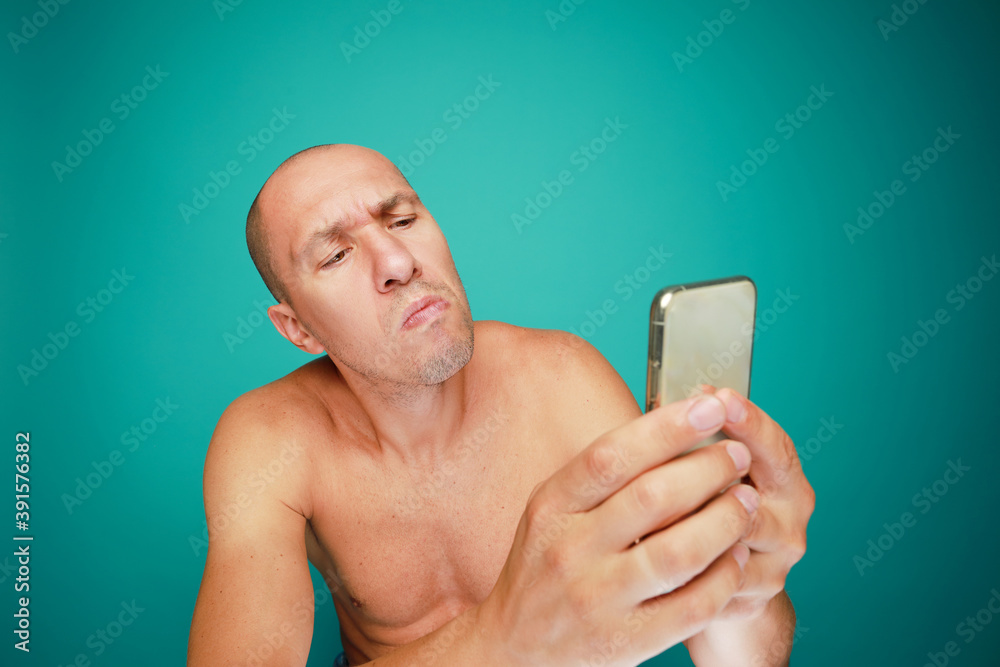 A funny bald and naked man with emotions holds mobile phone isolated on green background