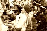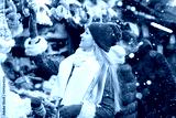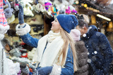 A girl in a blue hat looks at the Christmas market. Snow day before Christmas, buy and sale concept