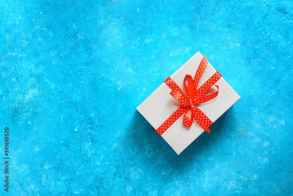 Gift with a red bow on a turquoise grunge background. Festive greeting card. Noel. Top view, flat lay, copy space.