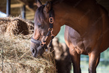 Beautiful brown Arabian horse in the stable - door - wood - hay - sunset - summer - the horse grazes -eat hay -halter