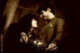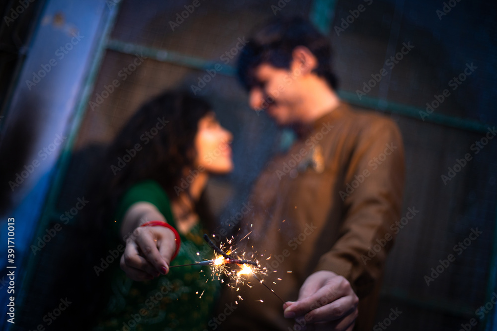 Happy young indian couple celebrating diwali festival looking at each other enjoying firecrackers as part of the celebration and holidays, Selective focus on sparkler.