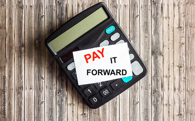 The phrase Pay It Forward in red text on a sticker placed on a calculator and a wooden table
