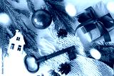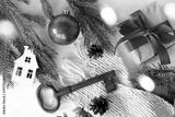 big key and white house with a red ball and a gift on a table with fir branches and a scarf top view. festive decorations for winter holidays