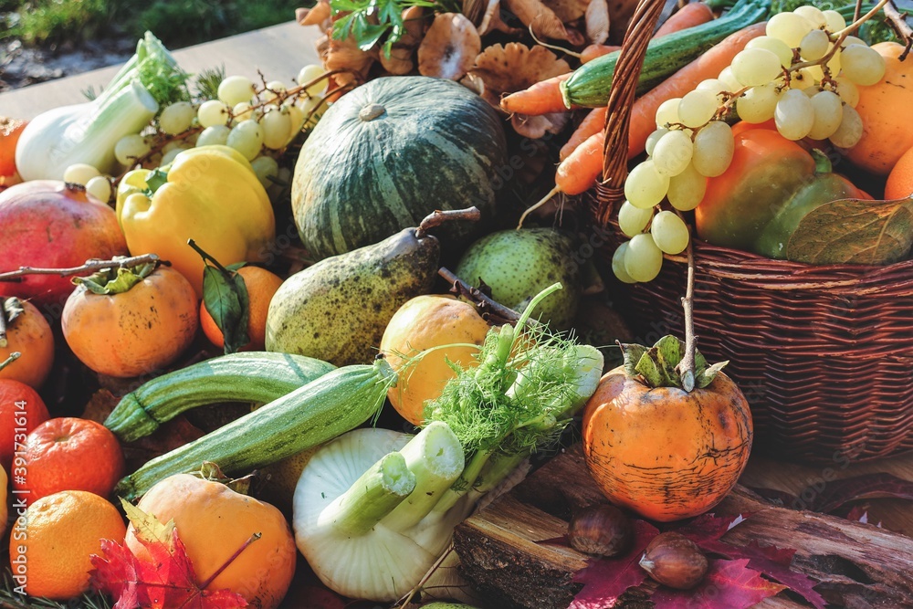 rustic autumn composition of fruits and vegetables - concept of seasonality