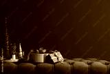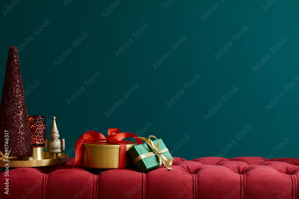 Christmas composition on the red velvet bench with decoration, gifts, wreath, lantern and accessories. Copy space. Red and green color. Template.