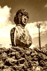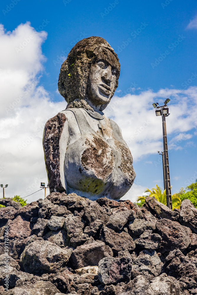 "La Métisse 77" a basalt statue located near Notre-Dame-des-Laves is a Catholic church on Reunion Island.