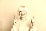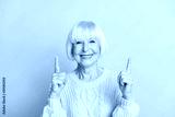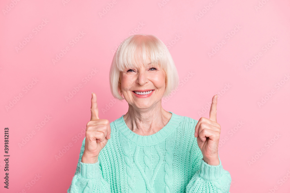 Photo portrait of pretty old lady pointing up at copyspace smiling wearing teal knitted sweater isolated on pastel pink color background