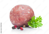 Fresh raw beef minced meatball with pepper and parsley on white background.