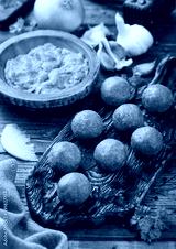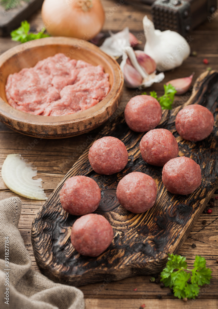 Fresh beef raw meatballs on wooden board with mince on bowl plate with pepper, salt and garlic.