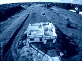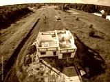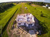 Aerial view on detached house under construction. House in basic state. Located on green plot in small village. Lack of wooden roof structure. Meadows