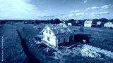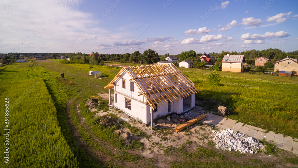 Aerial view on detached house under construction. House Ii basic state. Located on green plot in small village. Wooden roof structure. Meadows around.