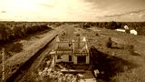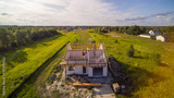 Aerial view on detached house under construction. House Ii basic state. Located on green plot in small village. Wooden roof structure. Meadows around.