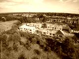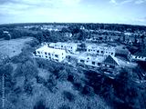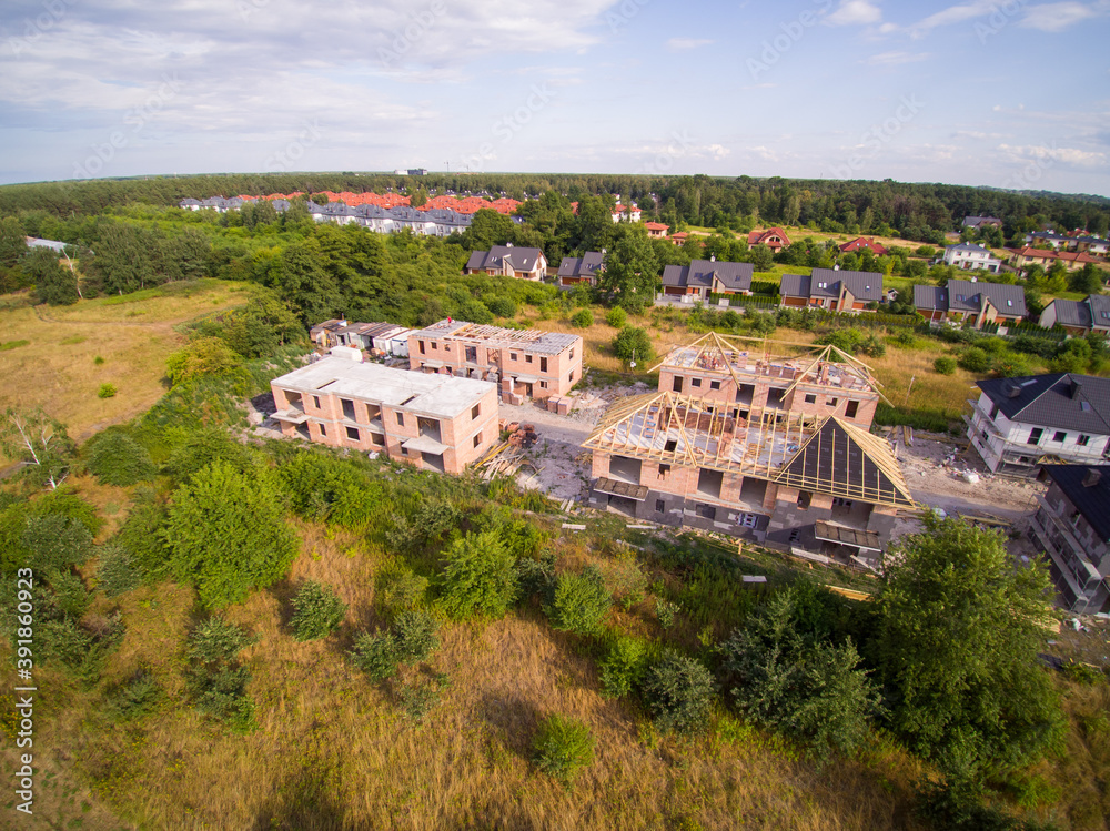 Aerial view on settlement of detached houses under construction. House in basic state. Located on green plot in small village. Wooden roof structure. Meadows around.