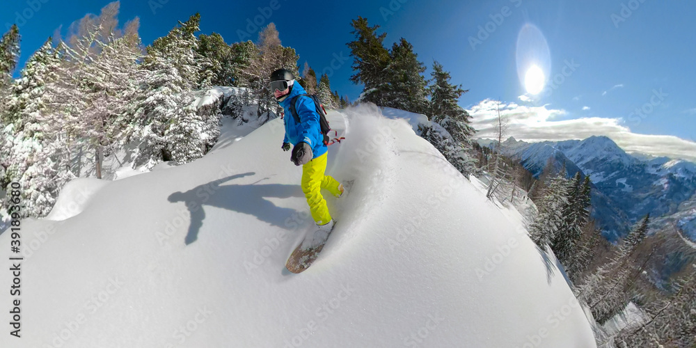 SELFIE: Young male snowboarder shreds fresh pow off piste in the Julian Alps.