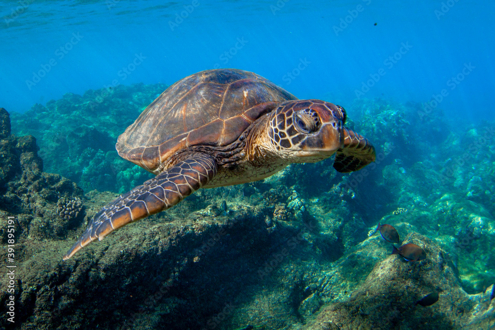 Hawaiian Green sea Turtle cruising in the warm waters of Maui