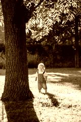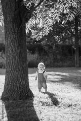 Cute baby boy standing under huge large tree in park on sunset. Adorable smiling child one year old toddler walking outdoors on backyard. Funny kid. Authentic lifestyle happy childhood.