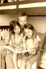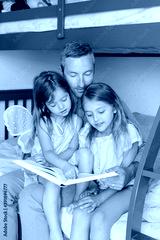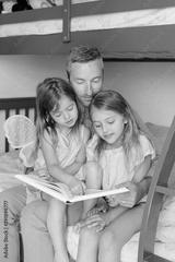 Fathers Day. Dad reading book to daughters girls. Family of three people sitting on a bed in bedroom. Happy father and children at home spending time together. Happy lifestyle childhood.