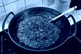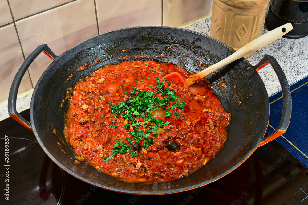 Bolognese sauce cooking in a wok on an induction cooker