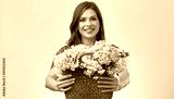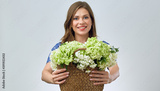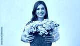 Smiling woman in blue casual dress with white green flowers.