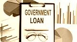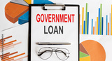 GOVERNMENT LOAN text . Conceptual background with chart ,papers, pen and glasses, business