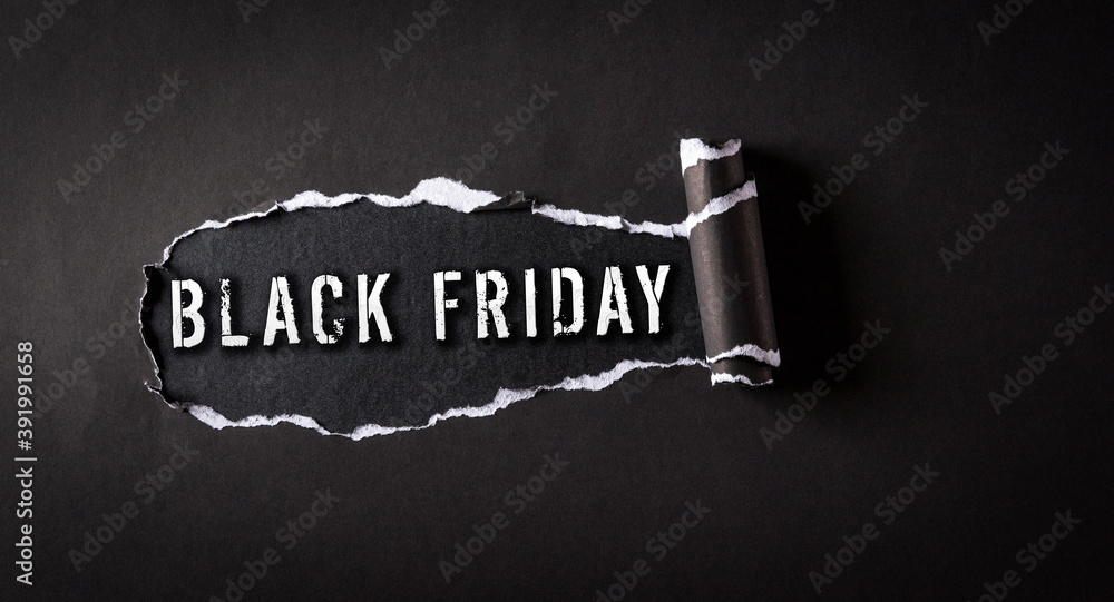 Top view of black torn paper and the text Black Friday on backboard background. Black Friday composition.