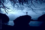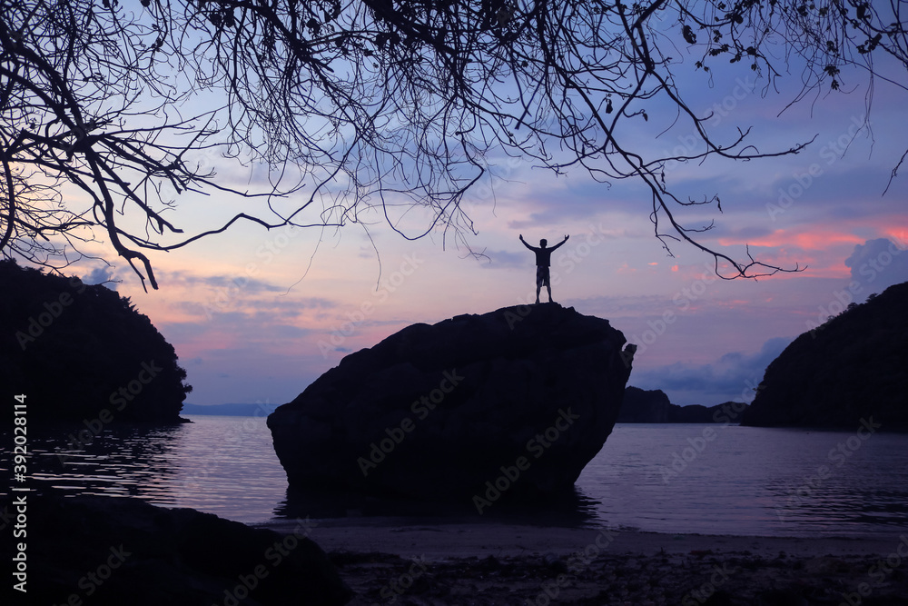 Man standing on top of a rock on the beach at sunrise, morning sky