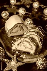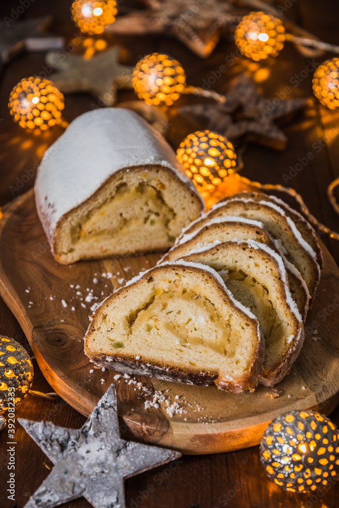 Christmas stollen on a wooden board, lights and christmas decoration in the wooden background, traditional german christmas cake, vertical stock photo