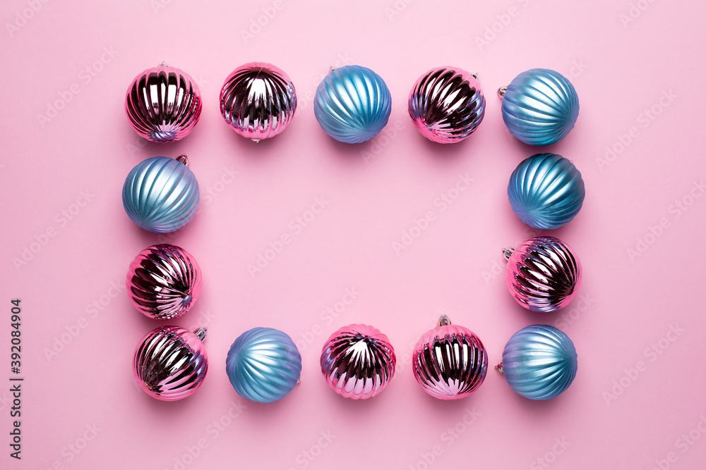Shiny Christmas blue and pink balls for decoration on pink background with copyspace, new year ball