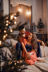 A young couple celebrates Christmas in a cozy country house concept of Winter holidays and Family holidays. Festive atmosphere.