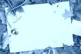 Flu and cold season frame on blue with fall leaves. Flu season or second wave. Face protective mask, sanitizer or soap and flu jab vial. Vaccine trial vaccination and immunization concept poster