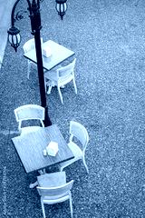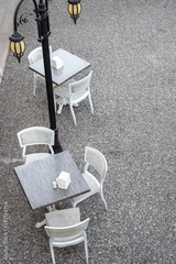 empty tables in a street cafe during a virus pandemic. New York city lockdown, coronavirus quarantine
