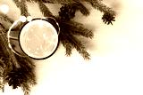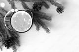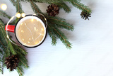 garland lights fill the red mug on the table with Christmas trees and pine cones top view. warming drinks for the holiday