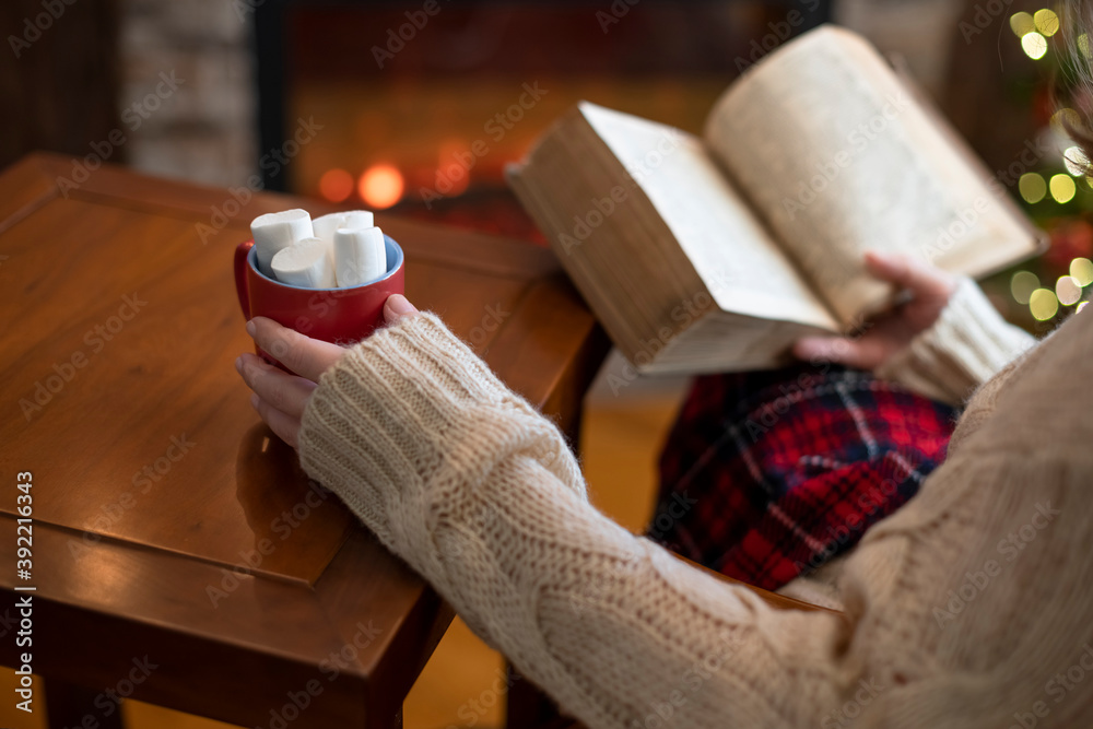 Woman hand with old retro book and cup of hot cocoa and marshmallow on wooden table near christmas tree and fireplace.