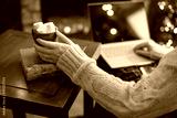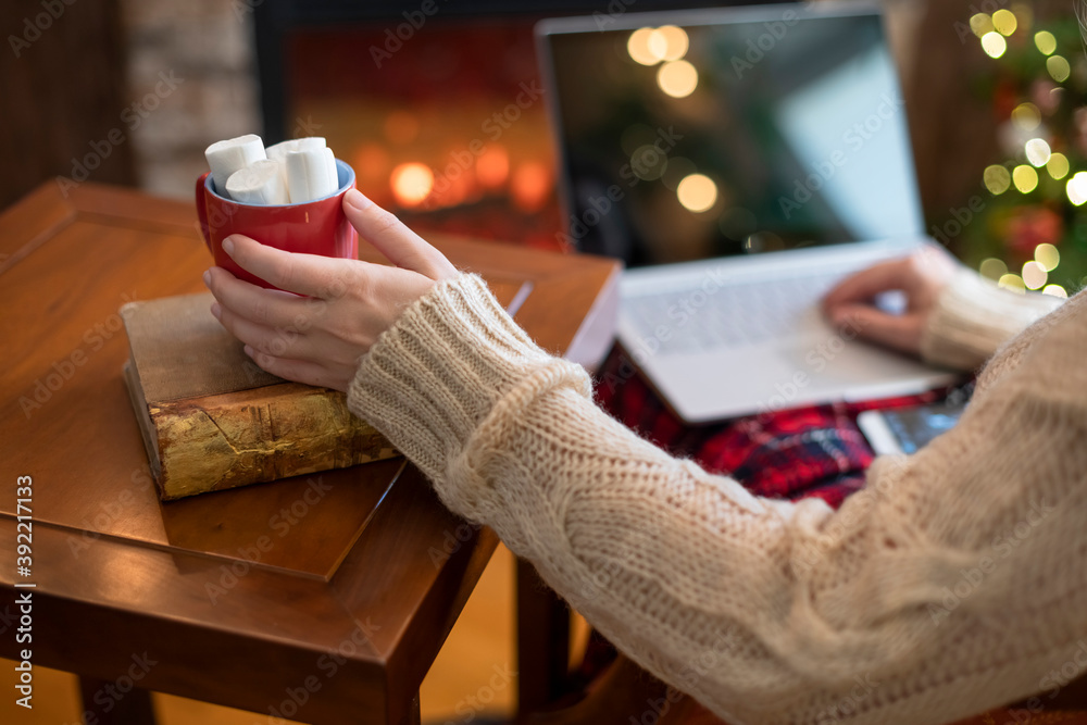Close up, cropped woman hand typing on laptop enjoying with cup of hot chocolate and marshmallow working in christmas time near fireplace with christmas tree.