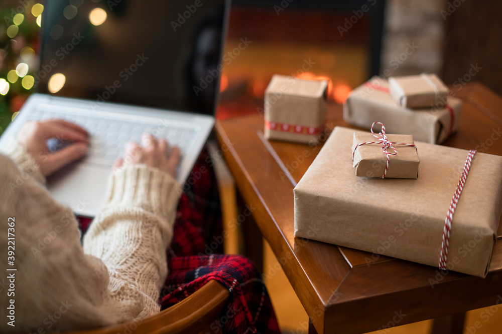 Christmas. Woman in sweater using laptop for searching gift ideas sitting at table near fireplace and christmas tree. Concept