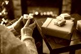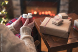 Woman covered plaid sitting and relaxation near fareplace and christmas tree with cup of cocoa and marshmallows after finishing packing gift boxes for family.