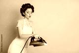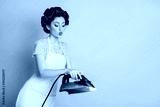 Photo of cute girl ironing copyspace lips pouted wear yellow skirt isolated over pastel color background