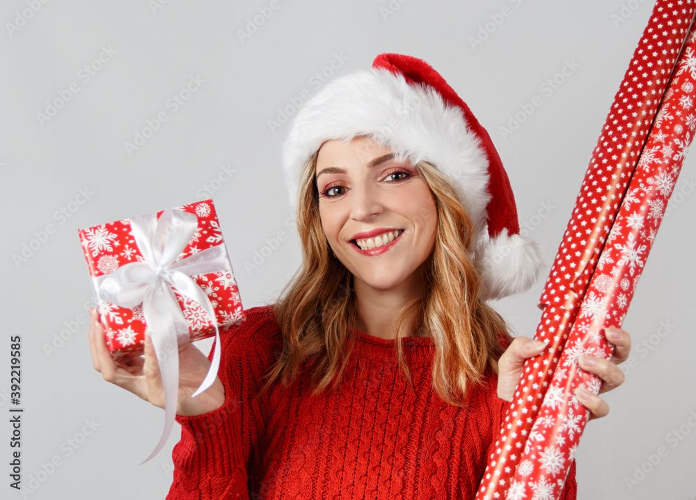 Young woman in santa hat holding wrapped present and wrapping paper roll