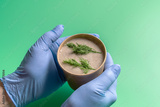 Hot soup in a paper disposable Cup for taking out or delivering food in a man's gloved hand on green background.