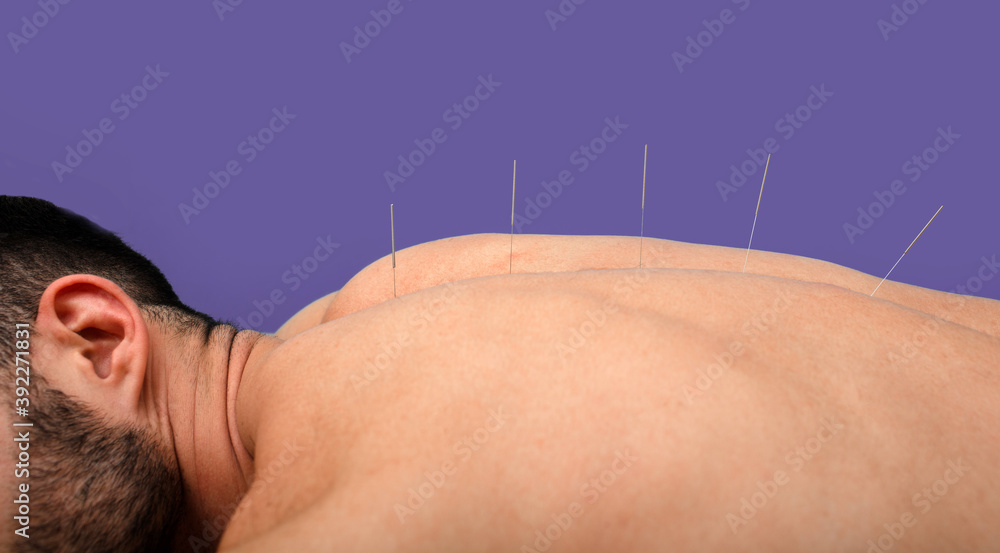 Man getting acupuncture treatment. Acupuncture needles close up on violet background