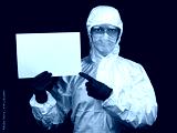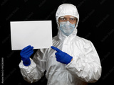 Doctor in a suit against COVID-19. A doctor in a protective suit, glasses and mask holds an empty sheet. Mock-up against coronavirus