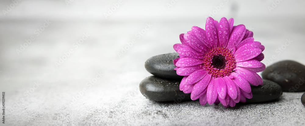 black stones and purple flower on white marble background. beauty treatment concept. banner copy space