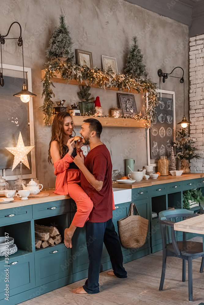 A young couple celebrates Christmas in a cozy country house concept of Winter holidays and Family holidays. Festive atmosphere.