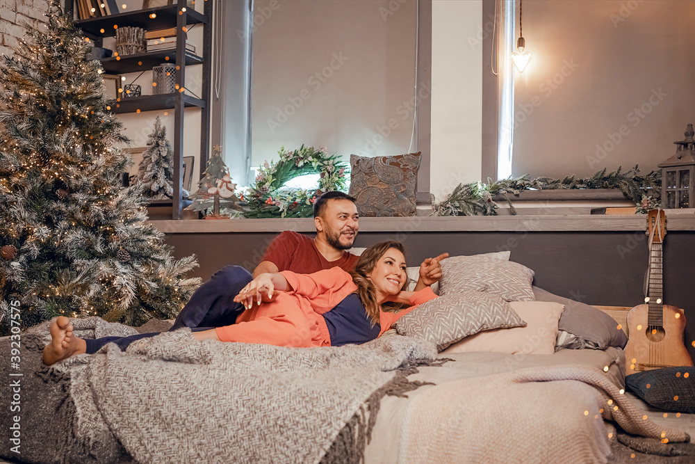 A young couple celebrates Christmas in a cozy country house concept of Winter holidays and Family holidays. Festive atmosphere.