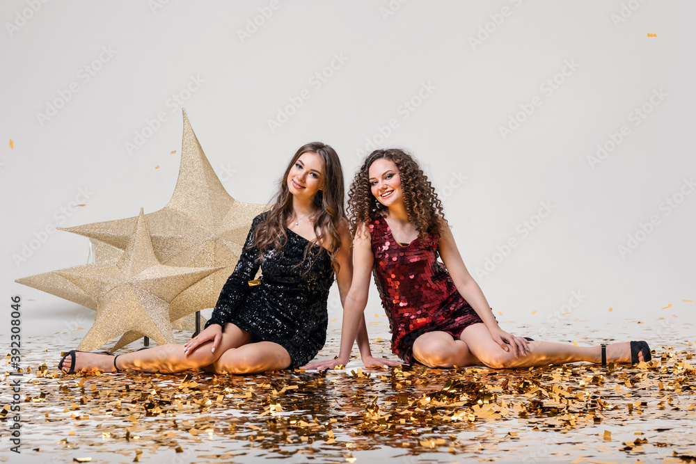 two young beautiful women in evening dresses at a party on a light solid background with gold confetti. the concept of the celebration, the beauty of the style